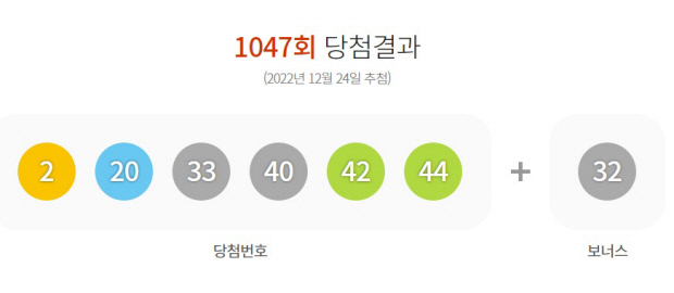 제1047회 로또복권 추첨에서 ‘2, 20, 33, 40, 42, 44’가 1등 당첨번호가 됐다. 1등 당첨자는 9명으로 이들은 27억 4880만원씩 받는다.